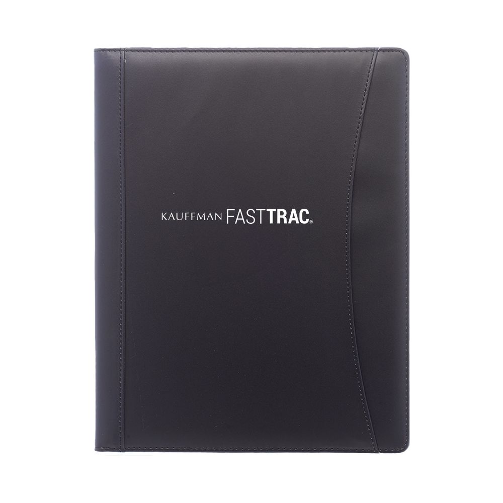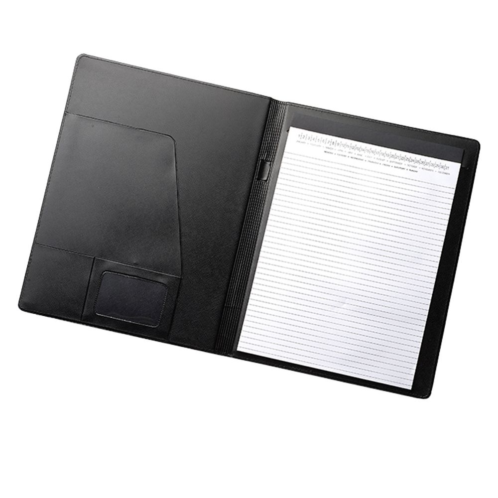 Available in black, our custom portfolios offer functionality and style. Each portfolio features an outside file pocket, interior pocket, ID holder, card pocket, and a 20-page ruled notepad with a date header.